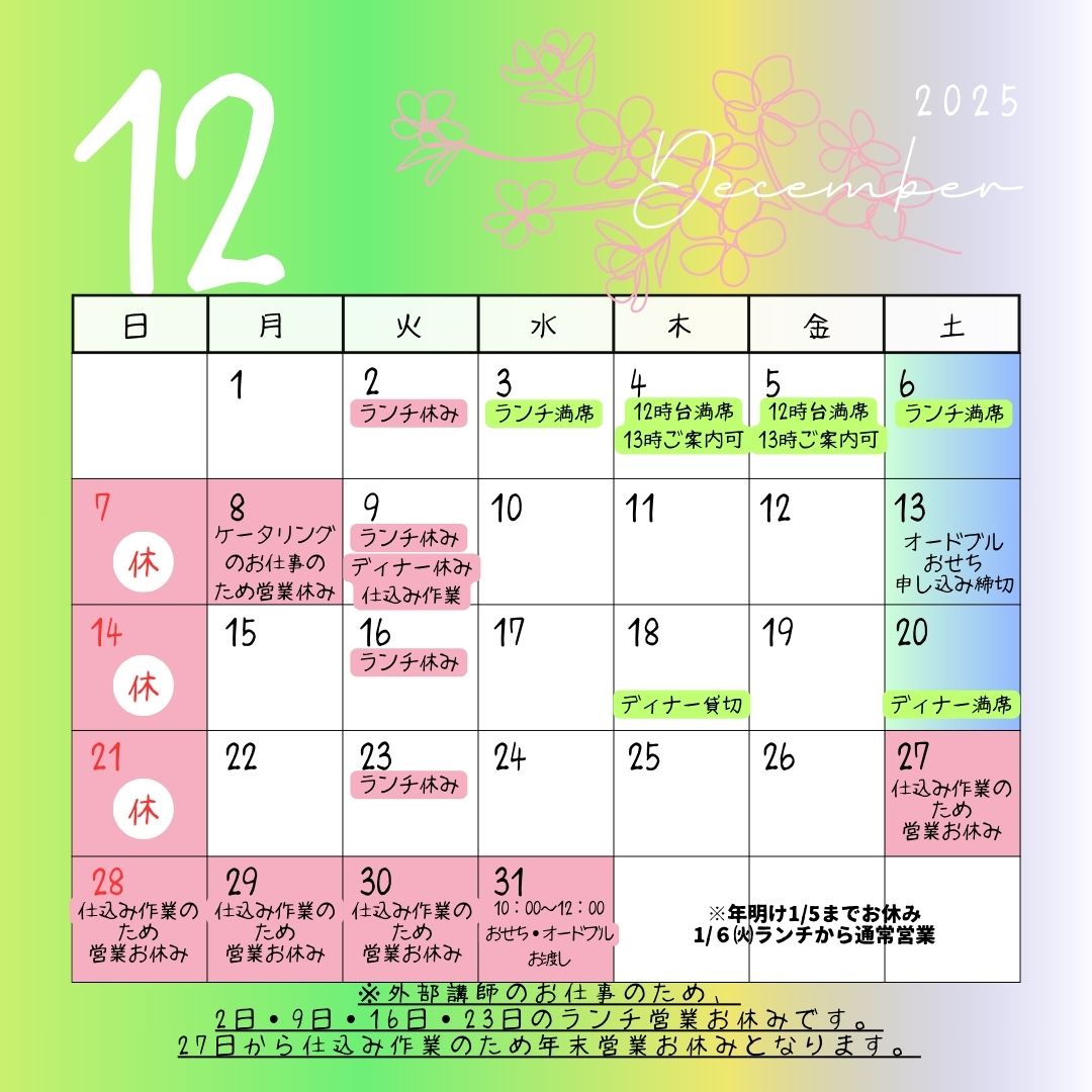 12月は毎週火曜日のランチをお休み予定でおります。