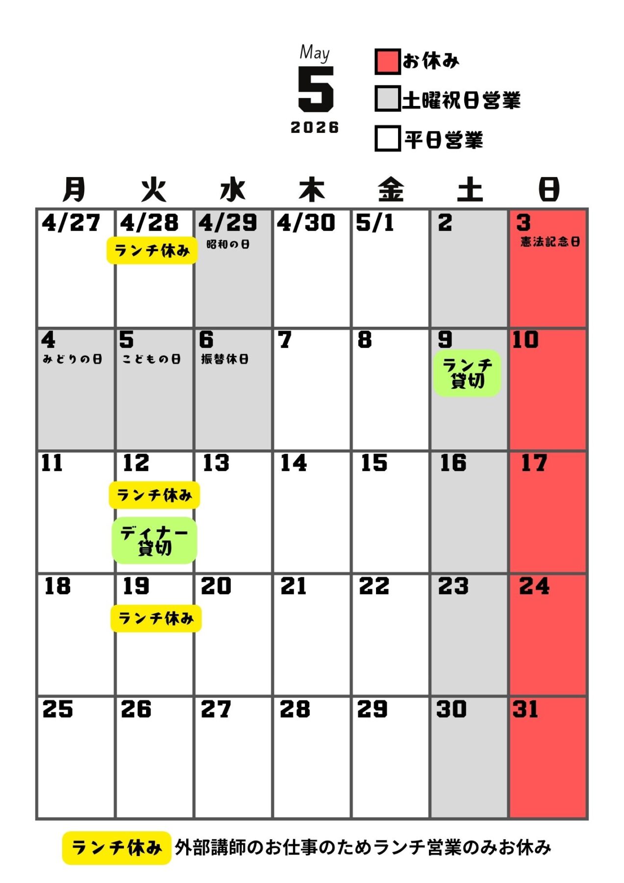 当店は日曜日のみ定休日ですが、毎月イレギュラーなお休みもあります。